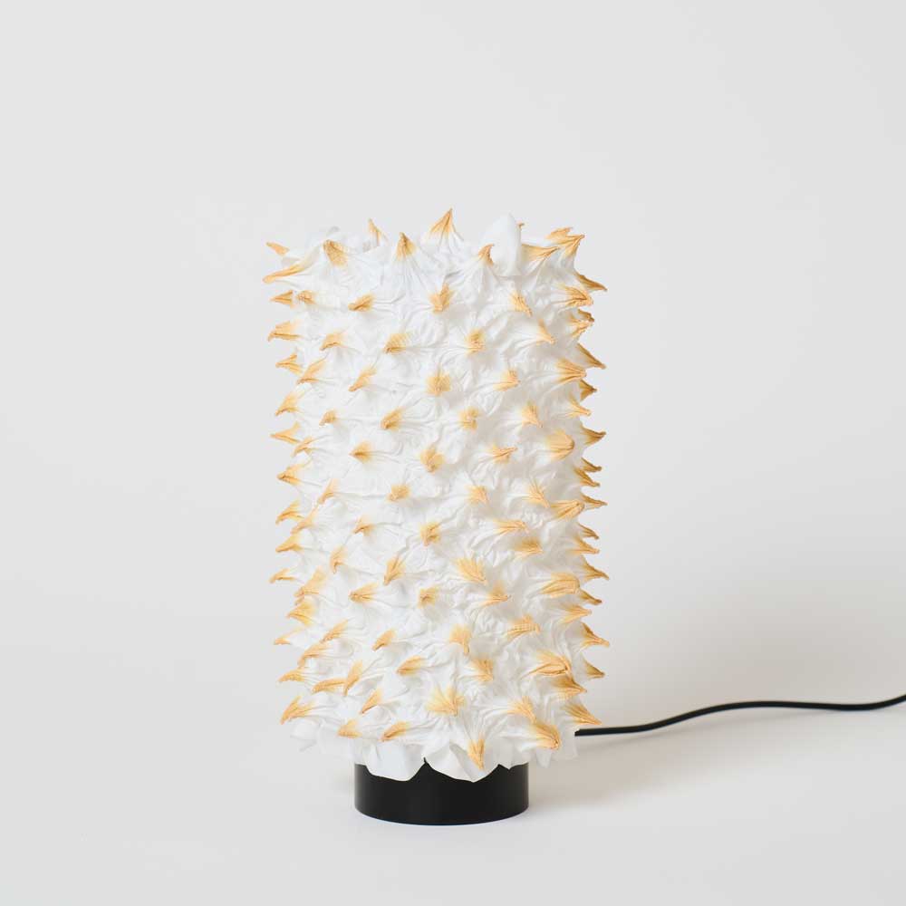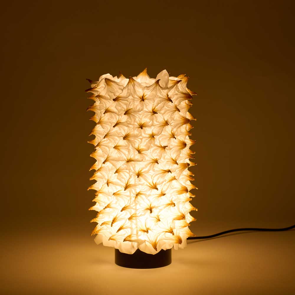 京都の伝統工芸、京鹿の子絞の「傘巻絞り」技法をほどこしたカバーをあしらったライトです。絞りの特徴である突起部分が光を包んで柔らかく放ちます。